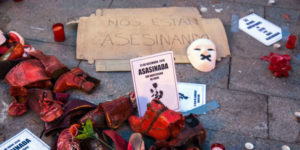 Placards and objects protesting gender violence. Banner